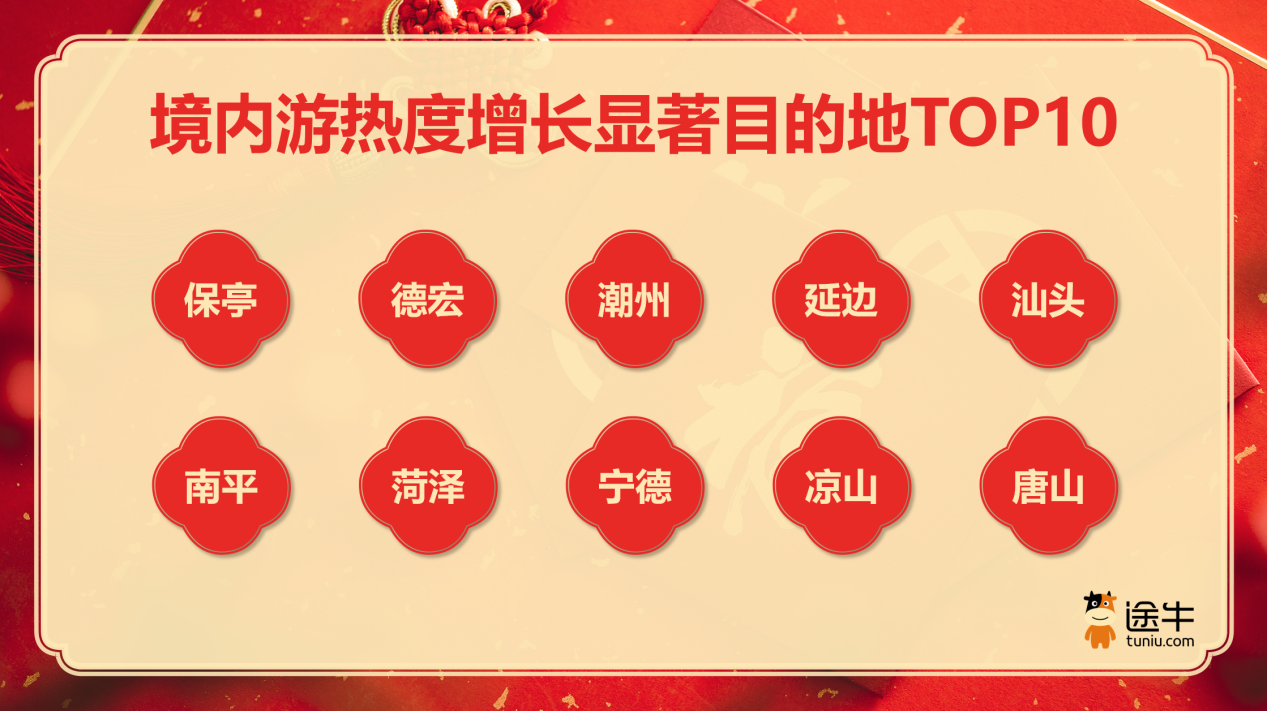 此外,一批“小而美”的小城、县城凭借特色年俗活动、地道美食、独特文化等强势“出圈”,成为春节旅游新潮流。其中,保亭、德宏出游人次较去年春节假期增长均超两倍;潮州、延边、汕头、南平、菏泽、宁德、凉山、唐山、金华、上饶、湛江、景德镇等目的地出游人次较去年同期均增长了一倍以上。