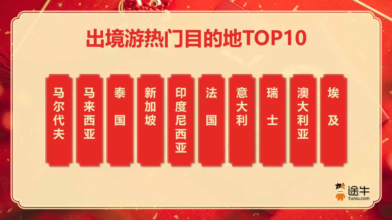 出境游热门目的地中,马尔代夫、马来西亚、泰国、新加坡等免签游,以及法国、意大利、瑞士、澳大利亚、埃及、德国、新西兰、阿联酋等长线深度游成为途牛用户的热门之选。