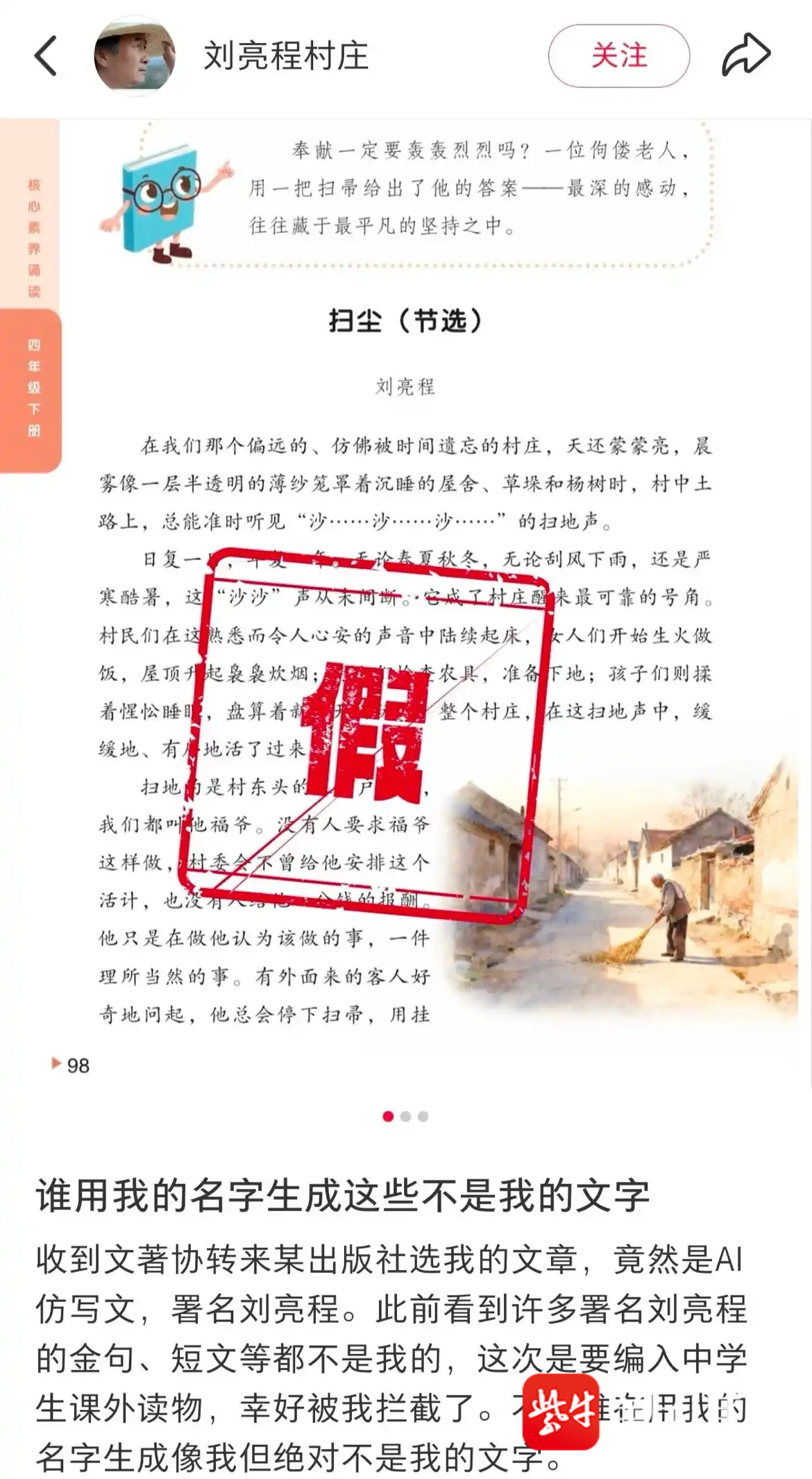 4月1日,作家刘亮程在社交平台上公开“打假”:一篇原来计划被编入中学生课外读物的署名文章《扫尘》,并非出自他手,而是由AI仿写而成。“不知谁在用我的名字生成像我但绝对不是我的文字。”