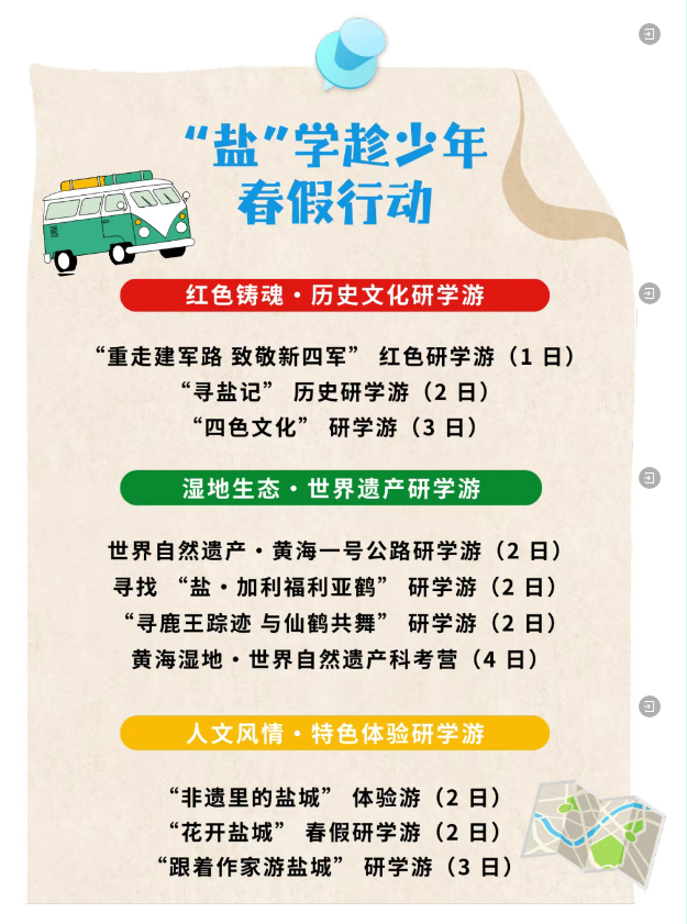 4月1日至4月6日,盐城文旅精心策划 “盐”学趁少年 研学行动,推出 10条主题研学线路 和 多重景区免票和优惠福利。这个春假,带孩子走进“行走的课堂”,在天地间上一堂自然与文化的启蒙课。