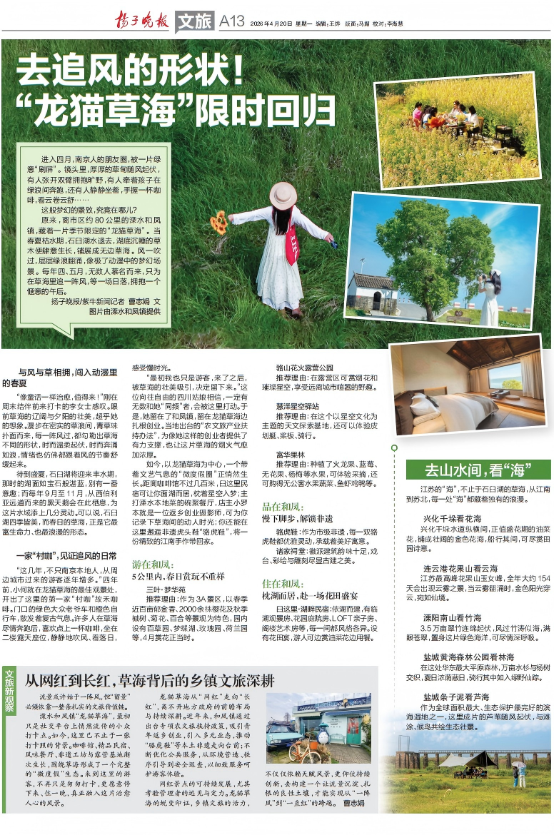 进入四月,南京人的朋友圈,被一片绿意“刷屏”。镜头里,厚厚的草甸随风起伏,有人张开双臂拥抱旷野,有人牵着孩子在绿浪间奔跑,还有人静静坐着,手握一杯咖啡,看云卷云舒……