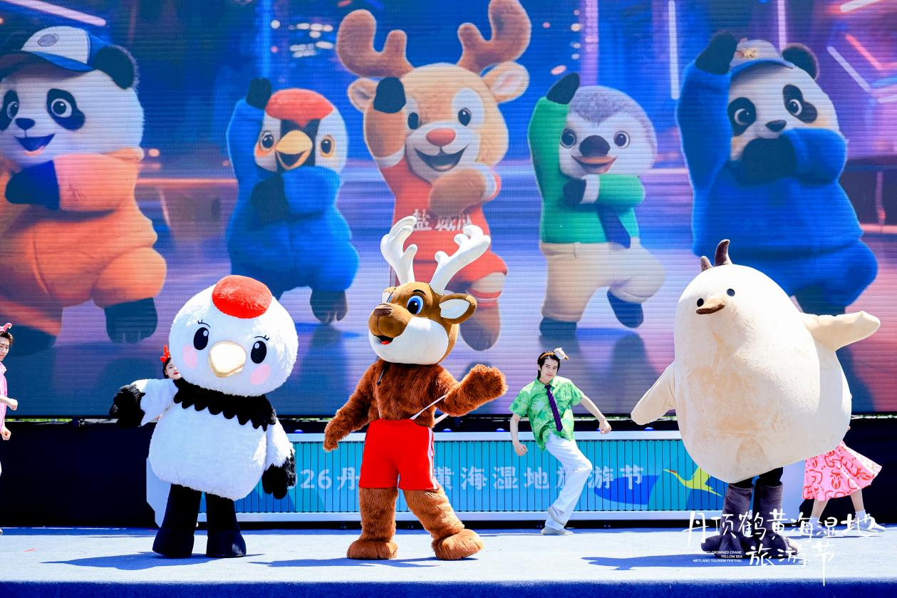 开幕式上,一场别开生面的“动物天团”奇妙联动惊艳登场。由“盐城三宝”丹顶鹤、麋鹿、勺嘴鹬携手南京江豚、成都大熊猫、敦煌神鹿,共同组建“动物天团”。从慢时光的“森呼吸”,到黑白奇遇的CP重逢,再到神鹿东渡的千年之约,这场跨越地理边界的趣味联动,串联起城市文旅IP,让风景有了情感,让旅途有了故事,为城市文旅跨界融合注入全新动力。