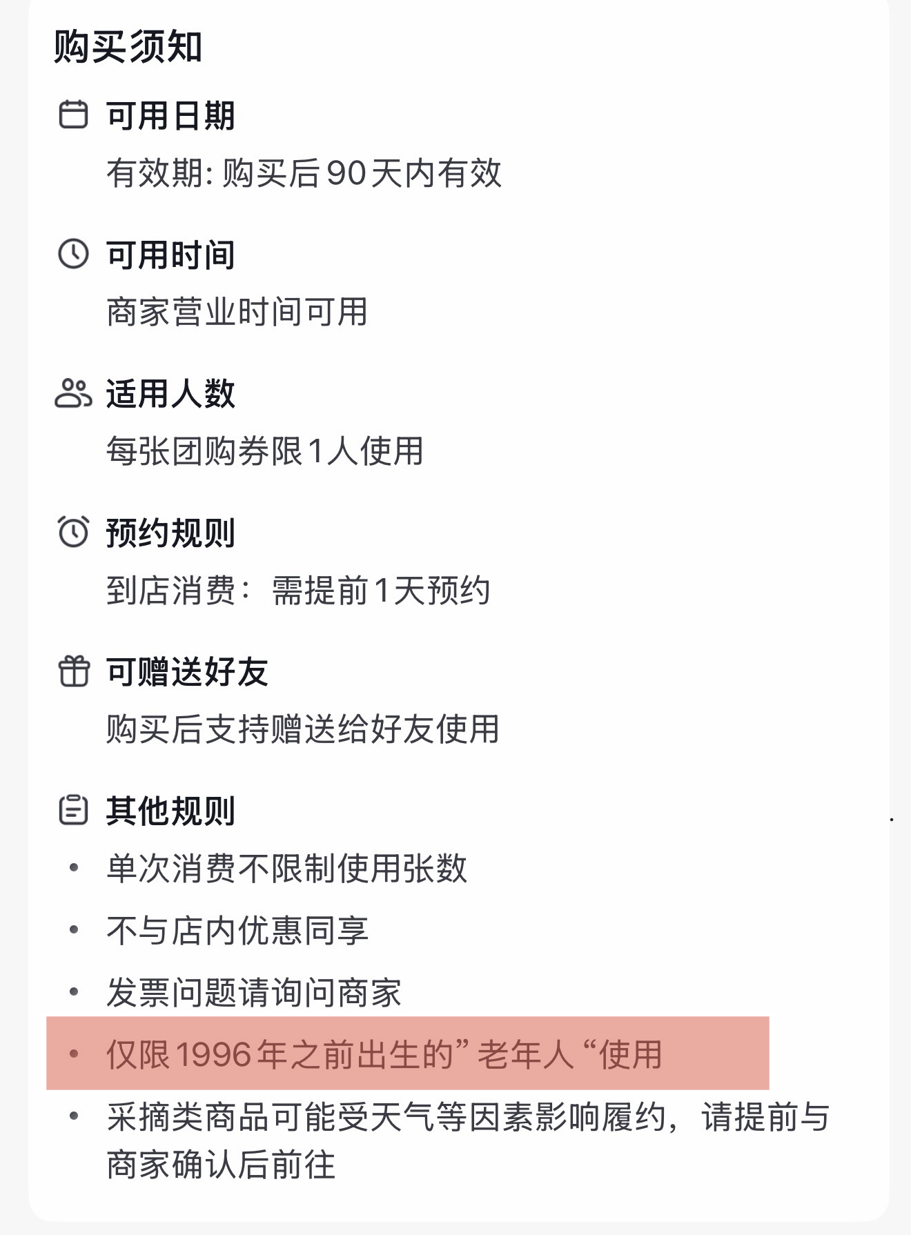 记者在购买页面上看到,景区推出的“老年人专享票”售价仅为9.9元(原价168.3元),包含水上探险、观花、萌宠乐园、森林探险及包含36个项目的童话世界等一票通玩项目,支持随时退、过期退,目前销量已超 100 份。购买须知里的 “提前1天预约”等规则都属常规操作,最引人注目的莫过于其限制条件——“限1996年之前出生”。按2026年计算,1996年出生的游客刚满30岁。有网友调侃:“1996年前出生的一觉醒来变成老年人了,居然可以跟我妈站在同一个梯队。”