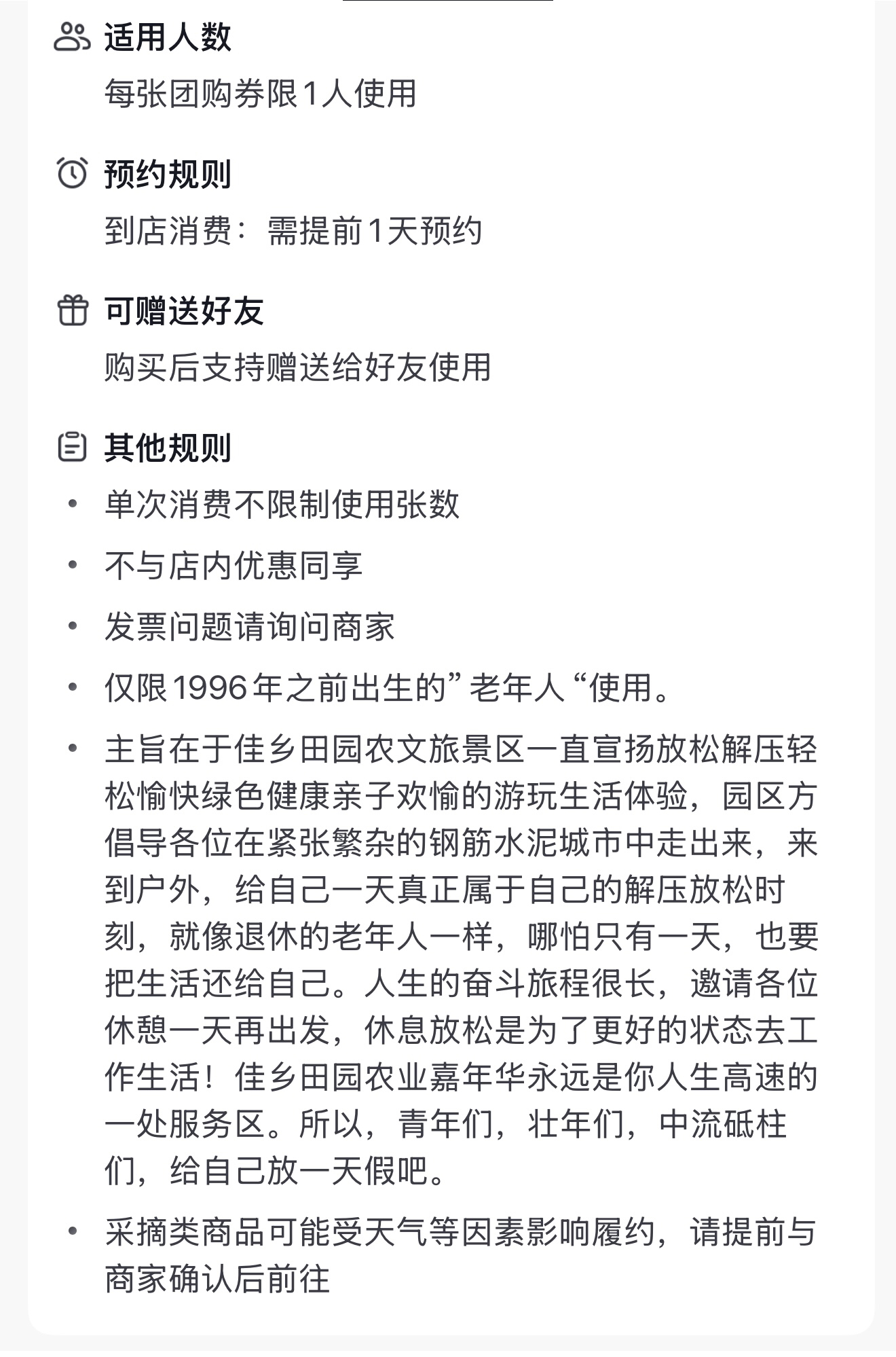 扬子晚报网4月27日讯(记者 金雨希)“老年人专享票,限1996年之前出生”——近日,山东聊城“佳乡田园”景区在短视频平台推出的一项团购活动,因年龄限制条件的“反向操作”引发网络热议。原本面向银发族的优惠,却精准覆盖了“90后”甚至“95后”,这一波“神操作”迅速在网络走红。