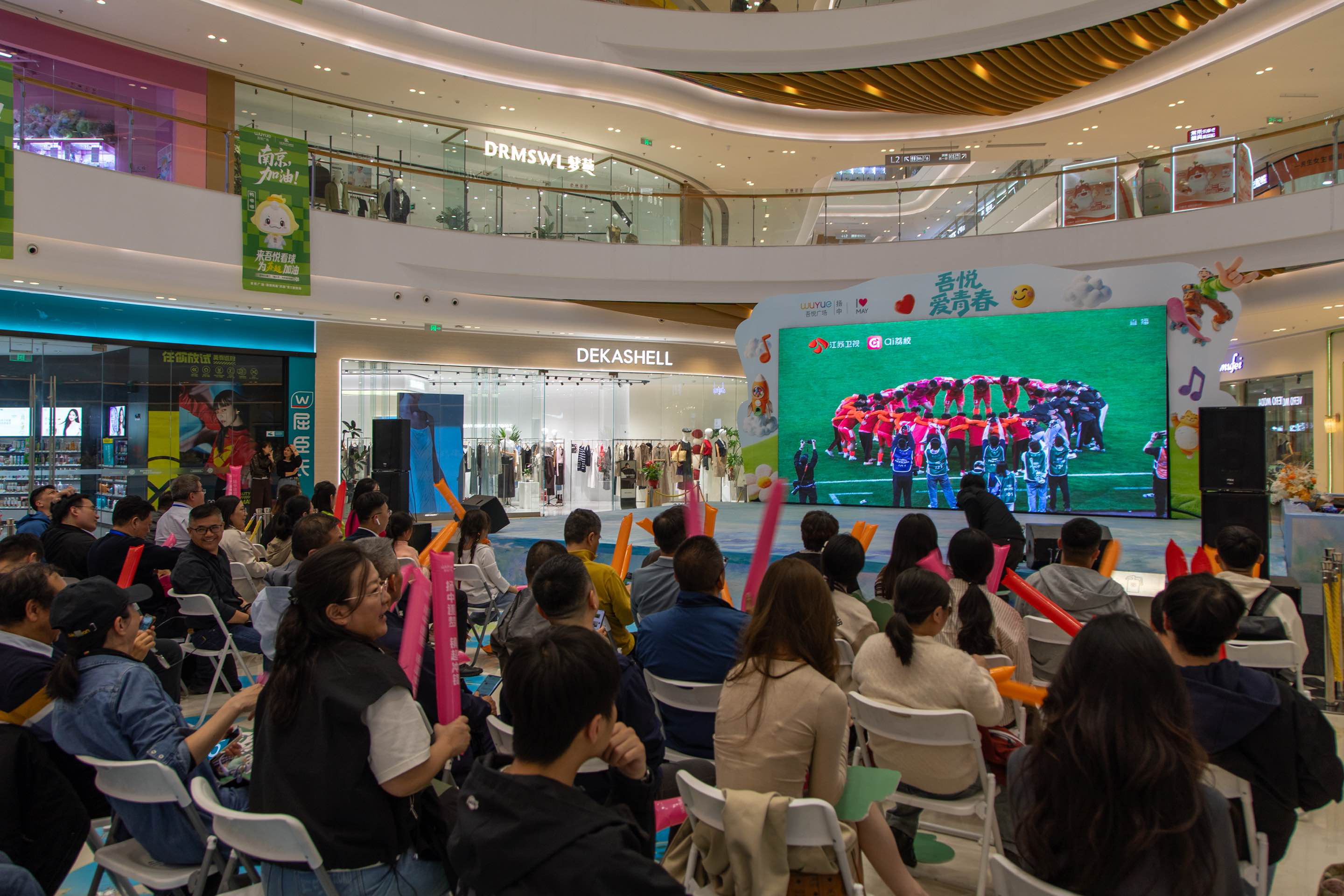 4月25日晚,采风团来到扬中吾悦广场“苏超”第二观赛点。数百名球迷聚集在大屏幕前,呐喊声此起彼伏。赛事直播间歇,周边夜市摊位的镇江锅盖面、扬中河豚等特色美食前排起长龙。