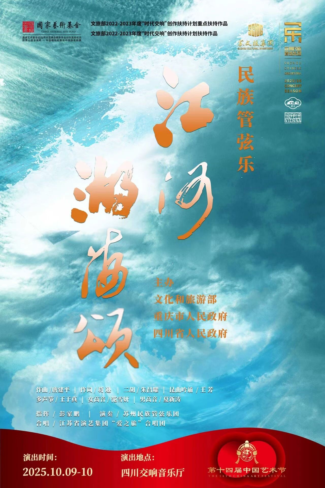 由苏州民族管弦乐团主演的民族管弦乐《江河湖海颂》以江、河、湖、海齐聚江苏省而构成的,独有的水韵风采为题,借题发挥意在歌颂与水生息相伴的“人”。歌颂万千年中华大地的风起云涌,歌颂中华民族生生不息,倾情演绎的生命华彩。通过融合昆曲唱诵,多声筝协奏,二胡协奏,领唱、合唱交响等多元表现形式,精心打造了《春暖江花》《云水流波》《湖岸风和》《海阔天极》等八个乐章,在交响音乐的宏大叙事中融入江南情韵,10月9日-10日这部作品将亮相文华奖的舞台。著名指挥家、乐团艺术总监兼首席指挥彭家鹏说:“我们追求的不只是技术的精准,更是通过音乐传递出水韵江苏的精神气象,让全国观众听到江苏江河湖海的呼吸,感受到这片土地深厚的人文底蕴。”