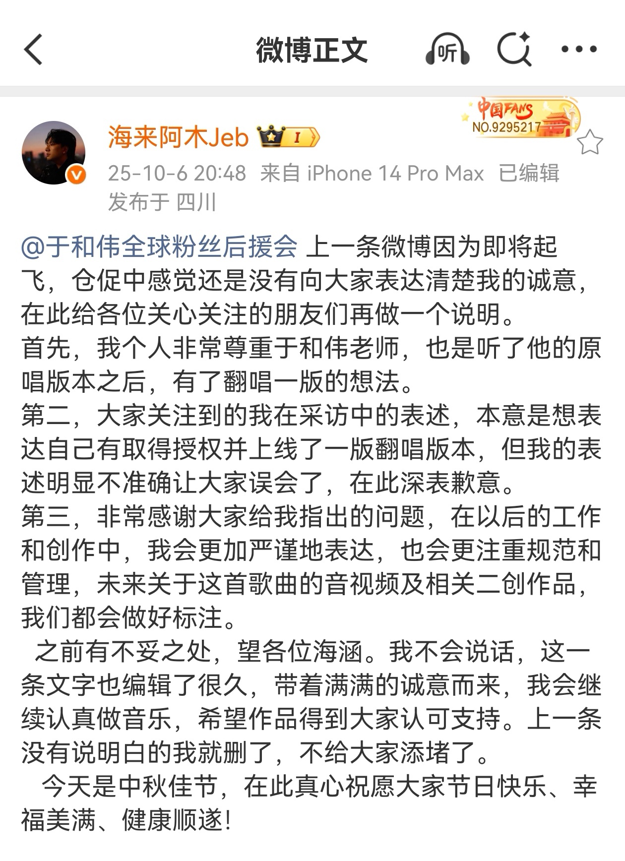 海来阿木在微博向于和伟全球粉丝后援会发布致歉声明。他表示,自己因在采访中对翻唱授权的表述不准确引发误会,对此深表歉意。