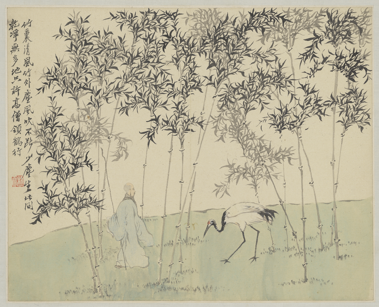 《高僧领鹤图》以疏朗笔触勾勒竹海清境,一高僧头戴斗笠,身穿宽服长袍,手扶竹杖,领着一只仙鹤,在竹林间闲行。画面左侧题有诗句:竹里清风竹外尘,风吹不断少尘生;此间干净无多地,只许高僧领鹤行”,下钤一印“游夫”。诗助画意,尽显文人超然物外的精神追求。