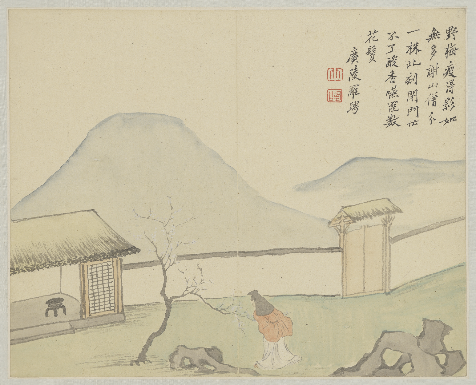 故宫博物院收藏的罗聘人物山水册,均题金农诗句,画作亦是模仿其用笔。罗聘20余岁就随金农学画,常为之代笔。山水册中有不少画作是按金农诗意创作甚至沿袭了金农画作的布局。此次展出的《观梅图》,就与金农七十五岁所作空间布局极为相似。