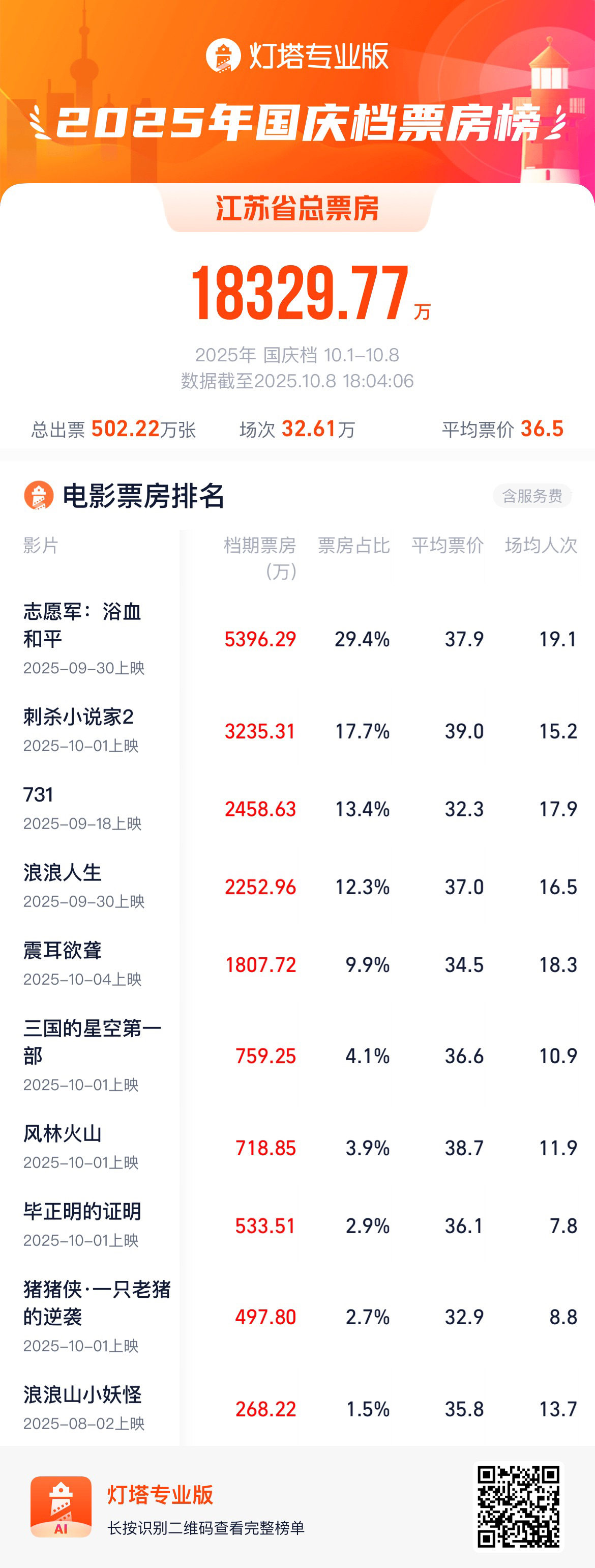 国庆档以超18亿落幕,江苏贡献1/10票房