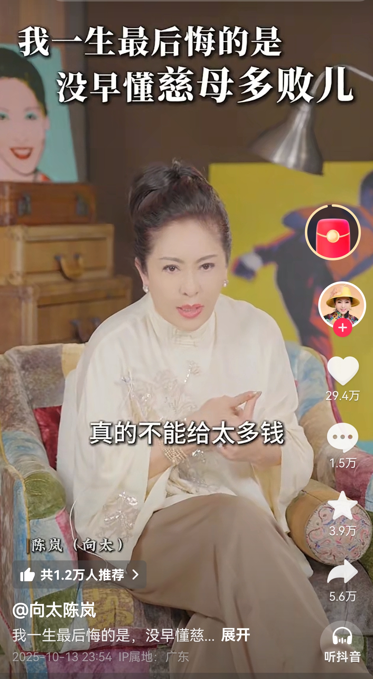 10 月 13 日,向太陈岚通过社交媒体发布视频,首次公开详谈次子向佑的成长经历,并结合自身经历反思家庭教育,提及 “慈母多败儿” 的感悟,引发公众对豪门子女教育及向佑个人情况的关注。
