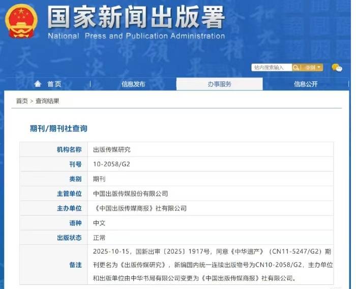 在该条微博中,“中国国家地理大遗产”还贴出了一张国家新闻出版署的正式批复。在国家新闻出版署网站,记者找到了这条“关于《中华遗产》更名为《出版传媒研究》及变更主办单位和出版单位的批复”,据该批复,《中华遗产》更名为《出版传媒研究》,主办单位和出版单位也由中华书局有限公司变更为《中国出版传媒商报》社有限公司。