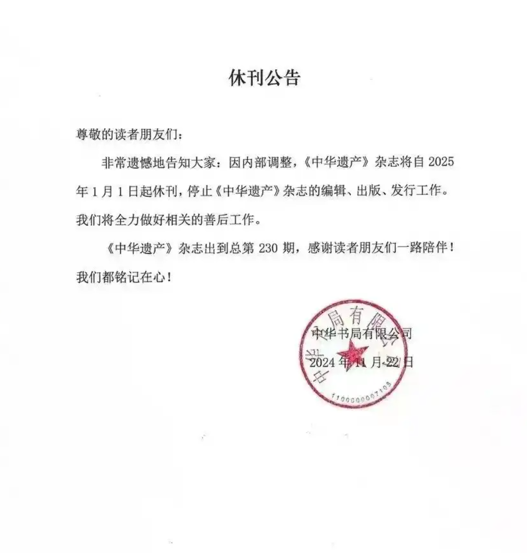 “2025年10月15日,‘《中华遗产》杂志’,卒。”10月20日,“中国国家地理大遗产”在微博官宣,《中华遗产》杂志正式与读者告别。
