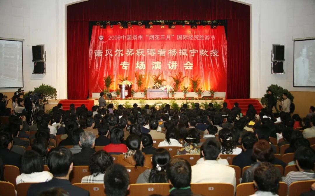 2009年4月19日,杨振宁先生再次应邀来扬大,为扬大师生作了题为《什么是创新》的专题演讲。他从近代历史上的重大科学事件讲起,他讲到了双螺旋结构的认识、电磁感应的发现这两个重大创新,认为“对于人类历史的贡献是无法估计的”。此外,杨振宁先生还讲起改变现代人生活的计算机的发明,同样,因为这项科技发明,人类迎来了一个新时代。