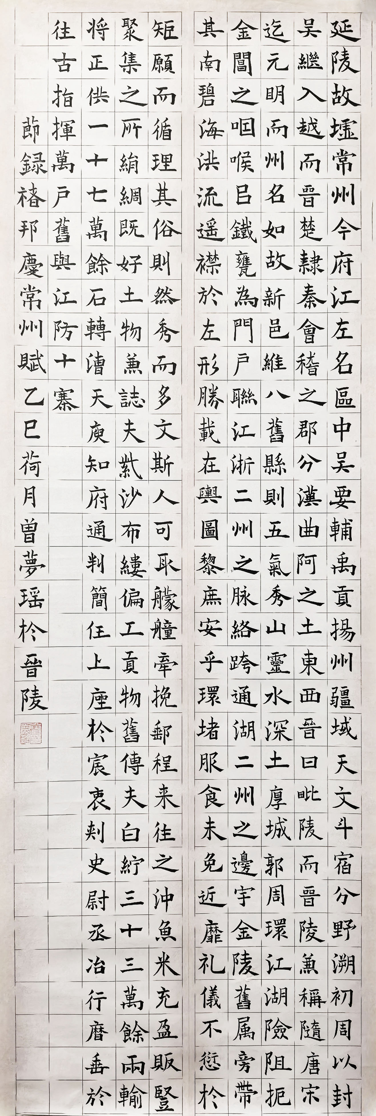 《常州赋》是由清代褚邦庆编撰的地方志文献,赋文详述常州自春秋延陵邑至明清时期的建制演变,通过清丽文辞,描绘当地山水关梁、陵墓祠庙等地理景观,被喻为文字版常州清明上河图。这幅作品由常州地区12岁参赛选手曾梦瑶所写。这幅作品为楷书,线条挺拔,横画起笔方整、收笔利落,竖画有力,转折处棱角分明,更偏向于欧楷。