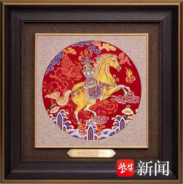 首次公开亮相的《龙腾骏业》,灵感源自清代《乾隆大阅图》,以圆形构图传递“天圆地方”的传统哲学。作品中,一匹鎏金骏马昂首腾跃、前蹄凌空,矫健姿态里尽显昂扬气势,马背上驮着一只宝瓶,寓意“平安吉庆”。南京云锦织造技艺代表性传承人陈诚告诉记者,该作品在继承古代织造技法的同时,大胆运用现代材料与工艺进行创新,马背上的宝瓶纹饰,采用传统螺钿研磨成粉制成的特殊线材织就。而为呈现金马的神韵,团队对金线的色彩过渡进行了反复试验与精准把控,整件作品耗时四个月才最终完成。