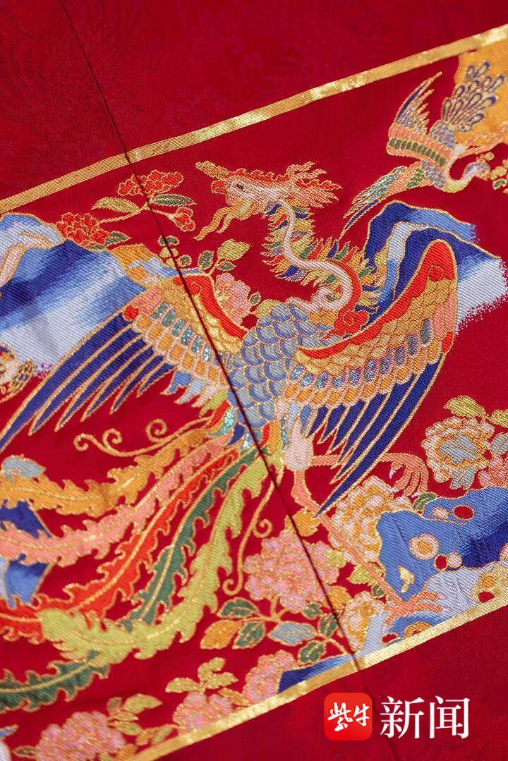 这件吉服的织造不仅严格遵循古法,更创新性地融入了现代科技。为追求极致的细腻效果,研发团队突破了常规云锦妆花每平方厘米约384格的意匠图绘制标准,投入超过336天的研发周期。细看颇为惊艳,作品中运用了现代科技制作的玉鳞线,使瑞鸟纹样在不同光线下折射出变幻的光泽,极大地增强了艺术表现力。“明代吉服本就采用云锦妆花技艺织造,如今我们通过新材料进行融合,让传统纹样焕发新的生机。”