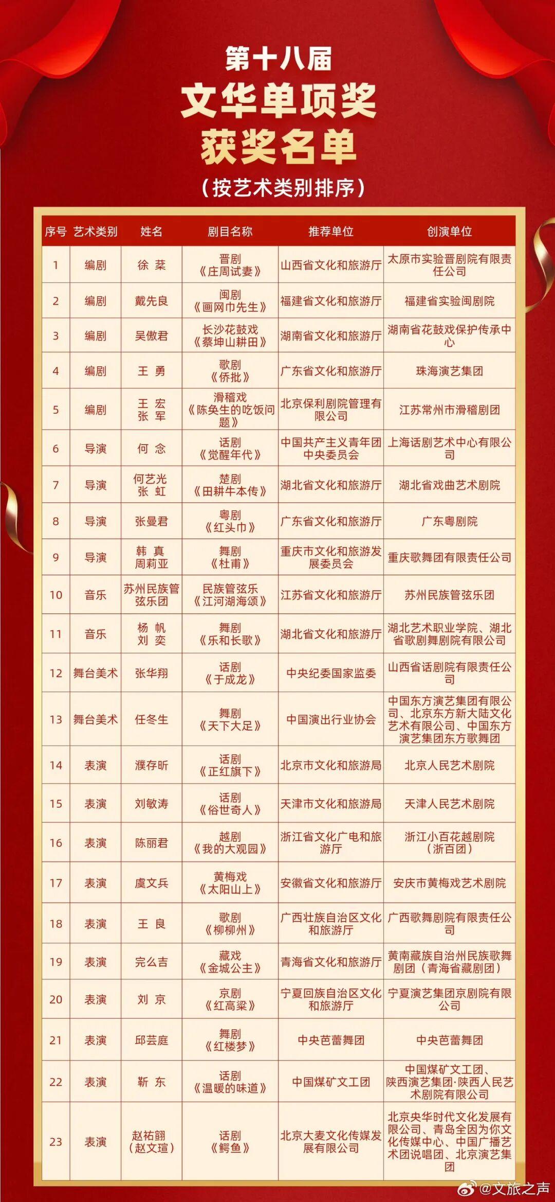 随着第十四届中国艺术节11月4日晚在重庆落幕,第十八届文华奖“文华单项奖”获奖名单也随之出炉。其中备受关注也是竞争最为激烈的“文华表演奖”的获奖名单可谓星光熠熠,濮存昕、刘敏涛、陈丽君、靳东、赵文瑄等榜上有名。