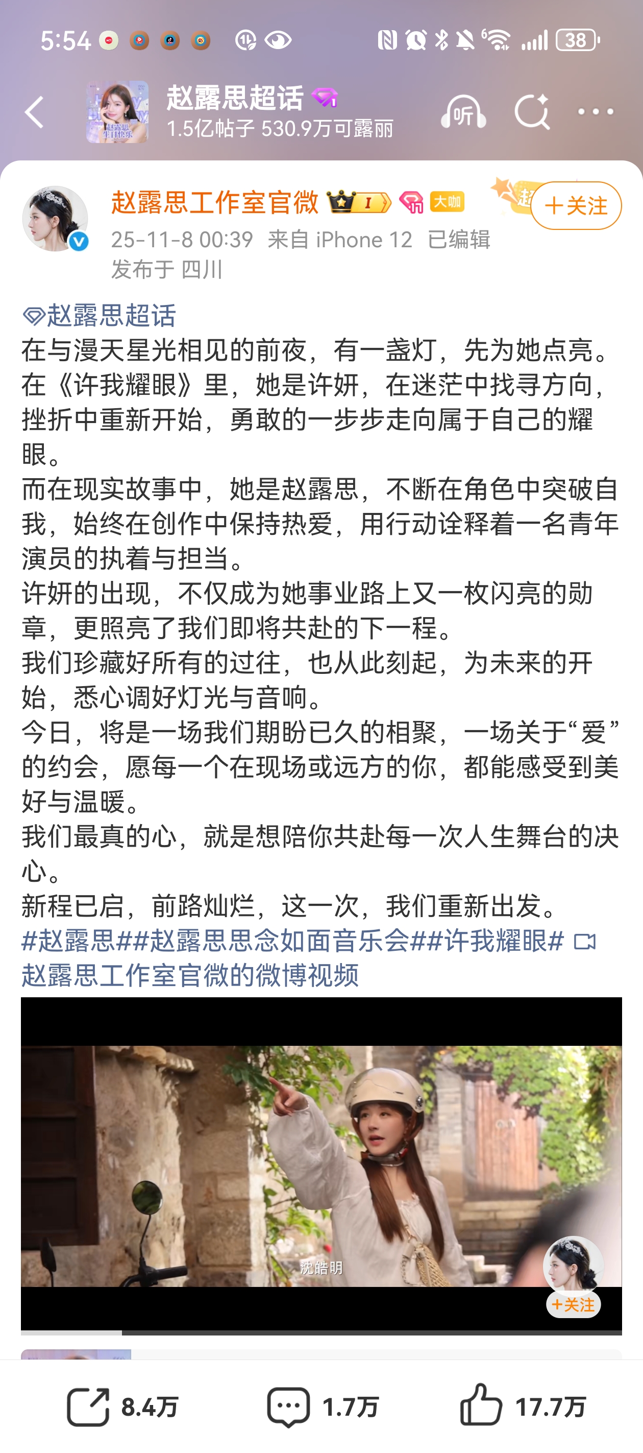 当晚,赵露思现场官宣成立个人新工作室,工作室官微也当天发文“重新出发”,并删除原经纪公司“银河酷娱”标识,正式开启事业新篇章。好友曾黎、银河酷娱创始人李炜、《许我耀眼》导演陈畅及制片人等嘉宾亲临现场,见证这一重要时刻。她动情致谢亲朋好友在艰难时的陪伴,更盛赞《许我耀眼》“给了自己第二次生命”,剧中饰演的许妍一角成为她低谷时的重要力量;同时感恩伯乐李炜——8年前签下平凡的她,37天前听闻她想与粉丝见面,便全力促成这场音乐会,一路支持从未缺席。
