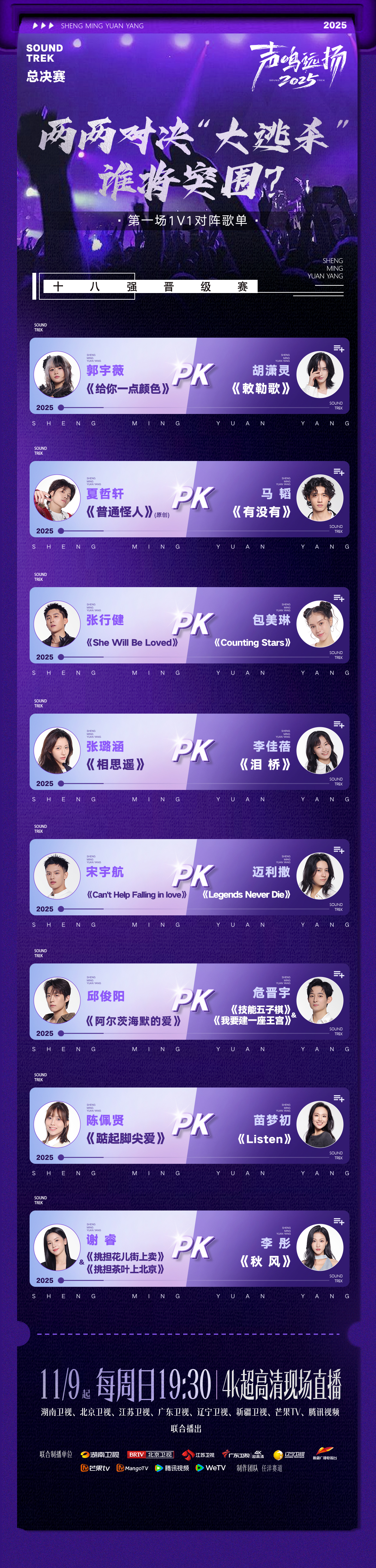 全国优秀歌唱人才选拔节目《声鸣远扬2025》总决赛将于11月9日(今日)起每周日19:30 4K超高清现场直播,湖南卫视、北京卫视、江苏卫视、广东卫视、辽宁卫视、新疆卫视、芒果TV、腾讯视频八大平台联合播出。