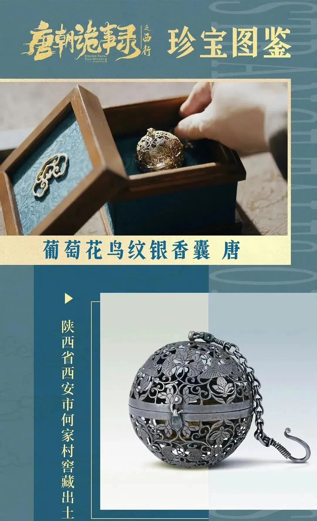 从历史博物馆到影视荧屏,武则天金简在《唐朝诡事录3》中完成了一次精彩的“活化”。事实上,以真实文物为创作锚点是《唐朝诡事录》系列一以贯之的创作传统,前作中的多件文物复刻案例,既保证了历史细节的准确性,也让悬疑叙事更具文化厚度。比如“四鸾衔绶纹金银平脱镜”,严格复刻了陕西历史博物馆馆藏文物。这件唐代铜镜以金银平脱工艺打造,镜背四鸾鸟衔绶带的纹样象征“长寿吉祥”,剧中将其设定为关联权贵秘辛的关键信物,既保留了文物的工艺细节与文化寓意,又通过虚构剧情赋予其悬疑属性,实现了历史价值与叙事功能的统一。