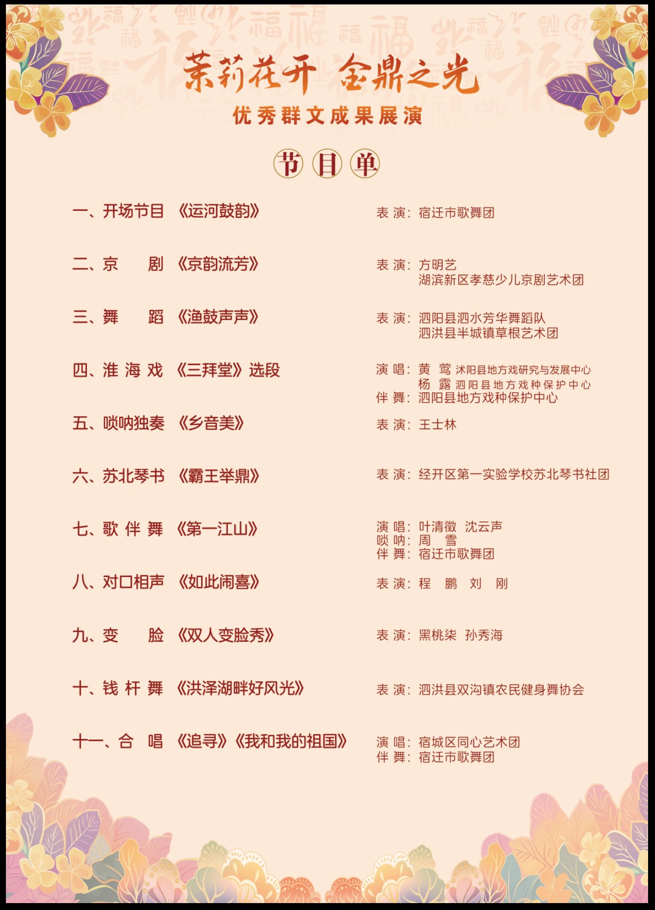 这场高水准的群众文化展演,让当地百姓看到本土文艺社团的繁荣,泗水芳华舞蹈队、半城镇草根艺术团、双沟镇农民健身舞协会等活跃在乡镇社区的团队纷纷亮相。此次展演正是宿迁市长期培育基层文化力量、激发群众主体性的成果体现。这场展演,不仅是一次成果汇报,更是宿迁群众文化事业枝繁叶茂、活力迸发的生动证明。