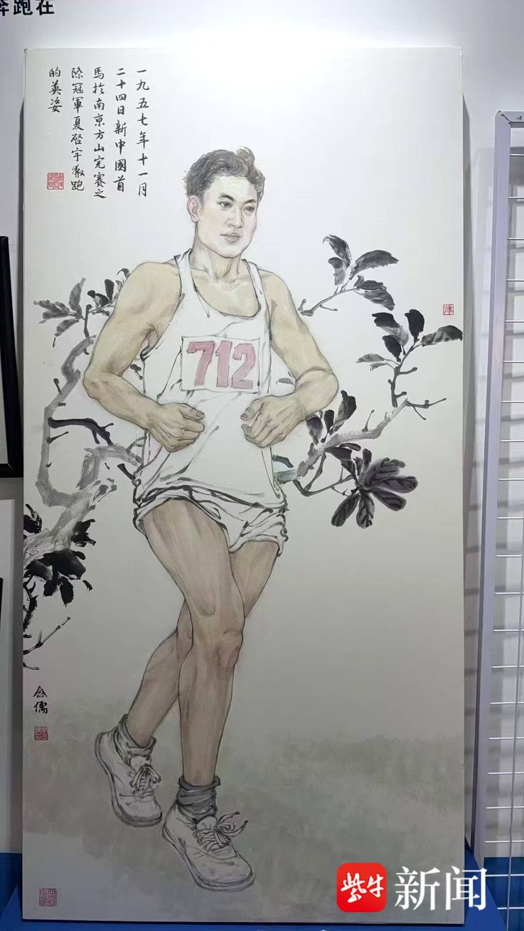 而另一幅画作,则是按照1957年11月报纸上刊载的江苏省体委工作人员、比赛筹办人魏廉拍摄的夺冠瞬间照片绘制出来的,将 1957 年 11 月 24 日,新中国首次马拉松比赛冠军夏启宇的夺冠瞬间,以极具张力的艺术语言呈现在大众眼前。