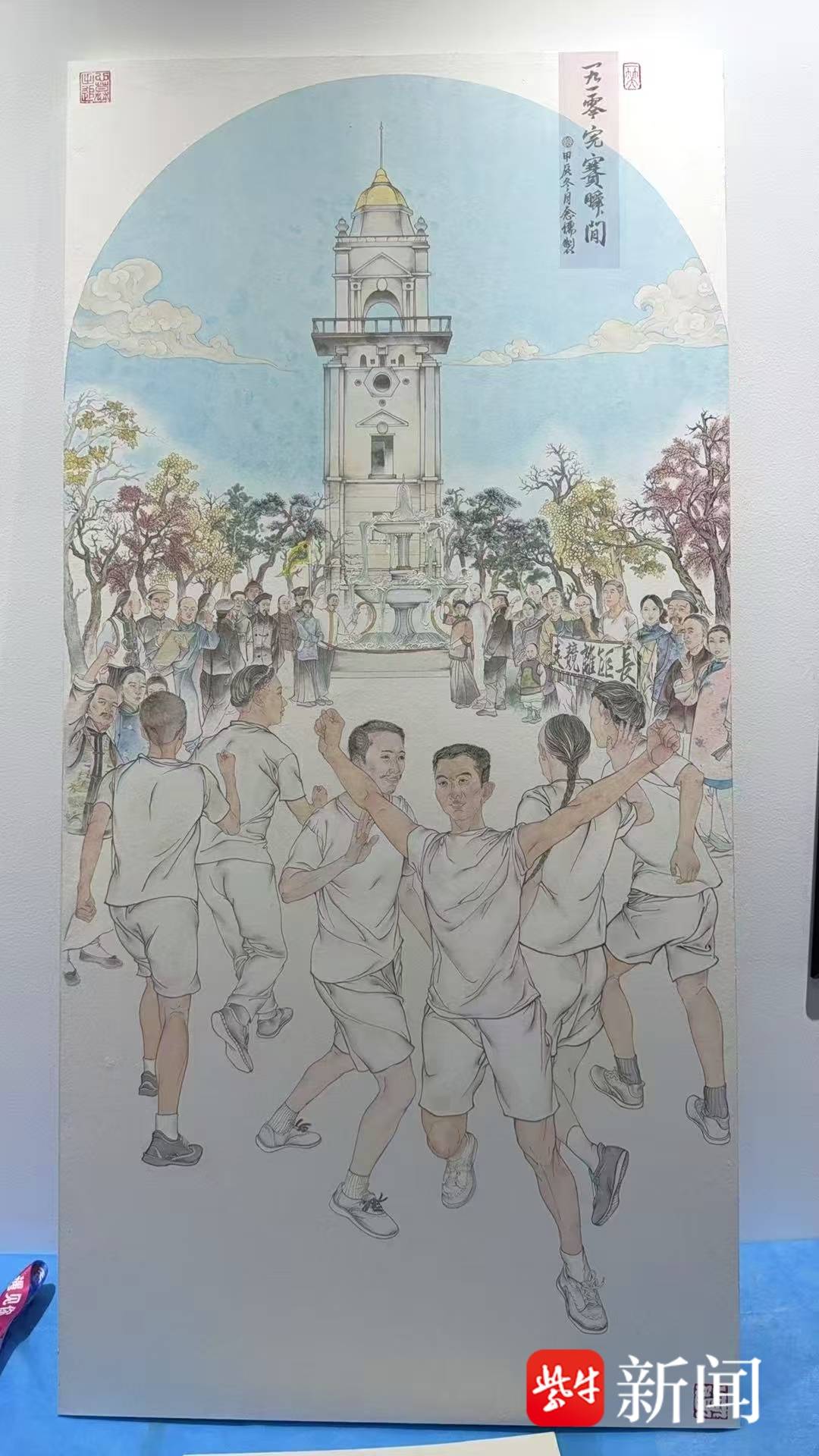中国作家协会会员、《中国马拉松之源》一书的作者栾川告诉记者,在绘画之前,画家和研究者进行了多次深入交流。按照1910年新闻界的报道,中国首次马拉松比赛最后完赛时,有6名选手齐头并进,同时到达终点位置——南洋劝业会纪念塔。遗憾的是,当时没有留下历史照片。在画家结合史实的想象和画笔的雕琢下,这段尘封的体育史瞬间迎来“复活” 时刻 —— 这幅画作将 1910 年中国首次马拉松比赛在南洋劝业会纪念塔前的完赛瞬间,鲜活地铺展在世人眼前。