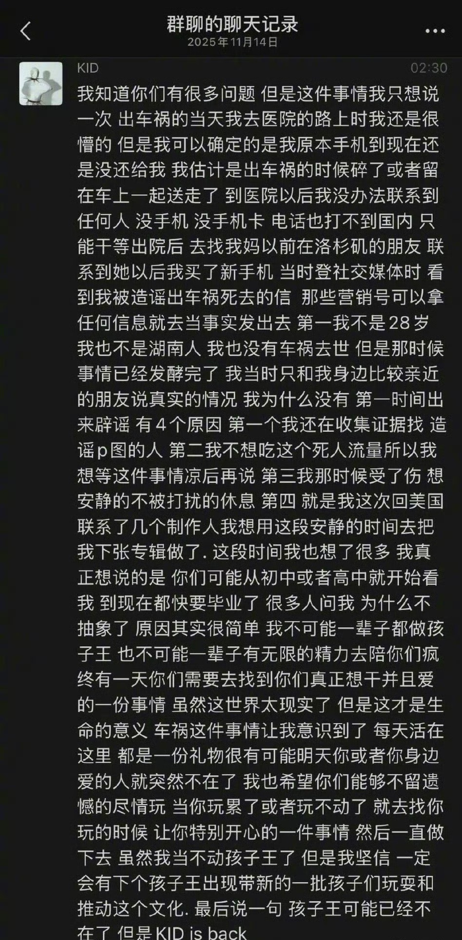11月14日,说唱歌手孩子王在粉丝群发长文官宣回归。但诡异的是,一个月前,他被传在美国遭遇车祸去世,此次他在粉丝群发长文回应传闻:车祸后手机遗失导致无法联系他人,发现 “去世” 消息发酵时已错过最佳辟谣时机,未及时回应是为收集相关证据,同时也想借这段安静时间完成专辑制作。该回应引发网友热议,不少人质疑 “这样的事也能拿来开玩笑吗?”