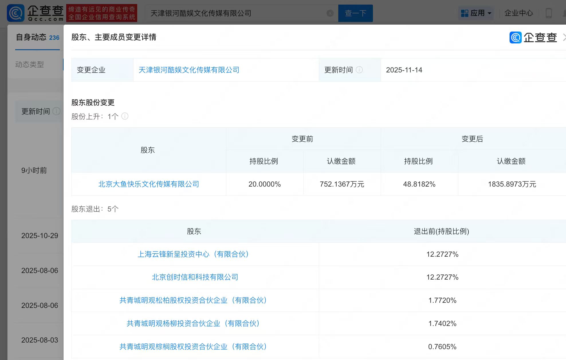 起因是企查查APP显示,近日,天津银河酷娱文化传媒有限公司发生工商变更,上海云锋新呈投资中心(有限合伙)、北京创时信和科技有限公司等5家公司退出股东行列,北京大鱼快乐文化传媒有限公司持股比例由20%升至48%左右,同时多名董事卸任。这一消息引发众多赵露思粉丝关注。