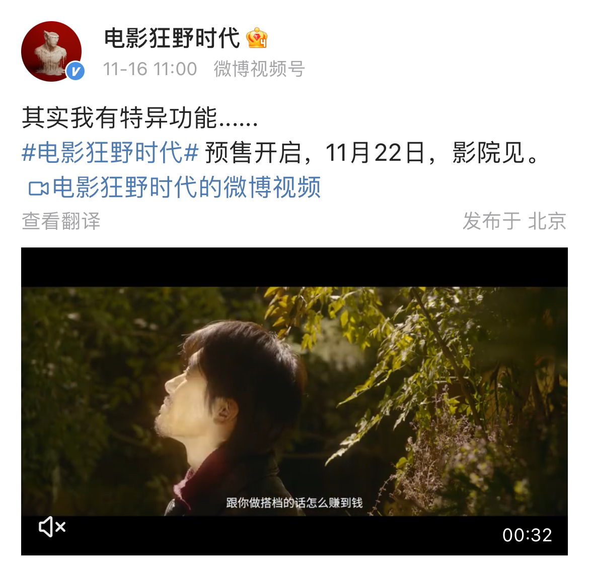 15日晚,24岁易烊千玺获得第38届中国电影金鸡奖“最佳男主角”,今天上午11点,@电影狂野时代 官宣开启预售,影片将于11月22日上映。