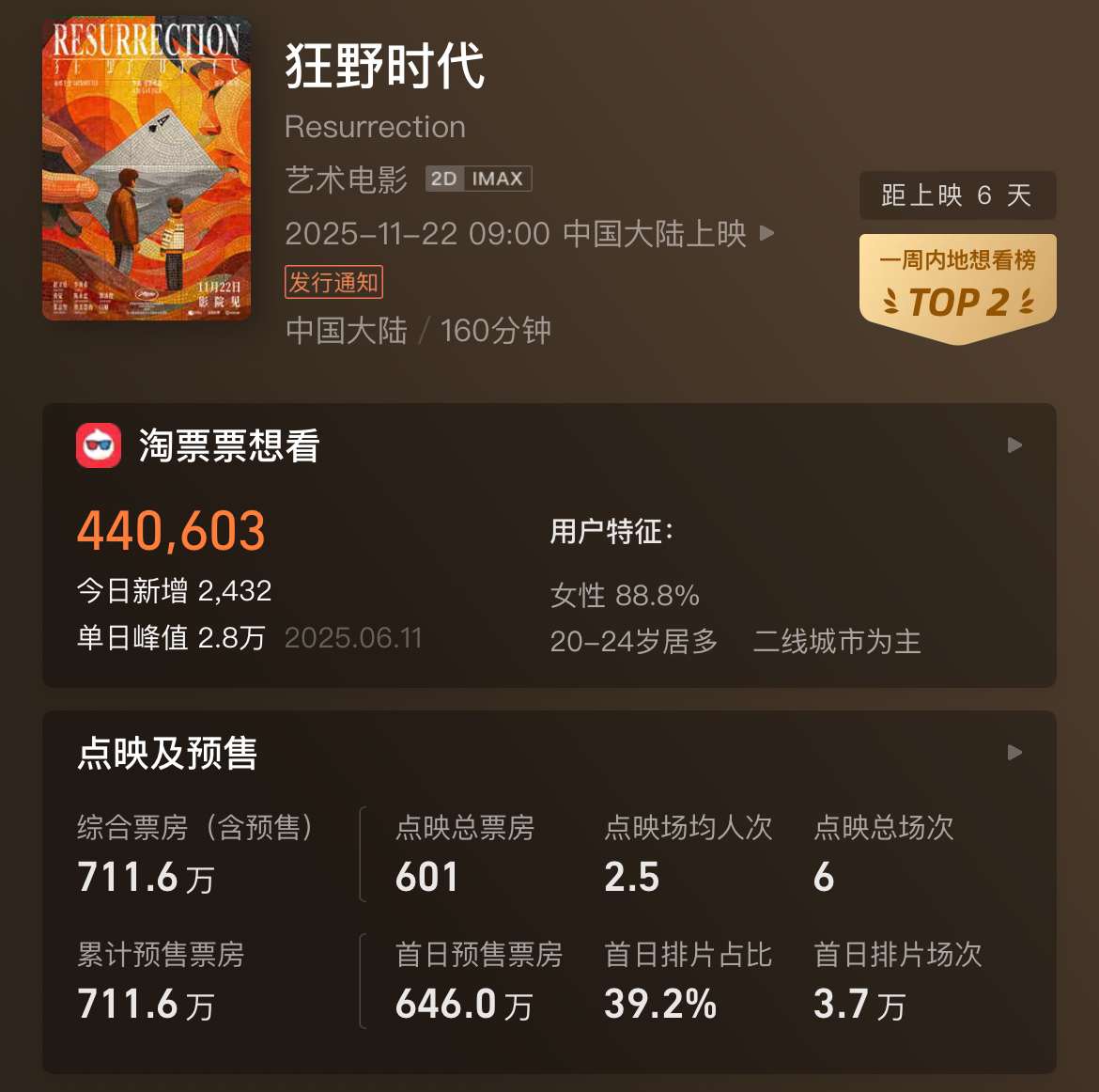 据预售页面显示,影片片长为160分钟,截至11:30,影片预售票房已破714万,观众特征中,女性占比88.8%,以20-24岁居多。