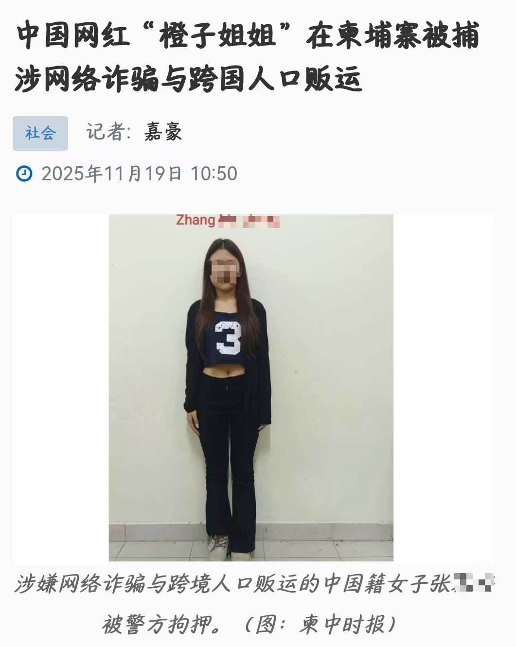 据《柬中时报》19日的报道,柬埔寨当局向《柬中时报》确认,此前被传在柬埔寨失联的中国网红“橙子姐姐”因涉嫌网络诈骗及与不法团伙非法跨境贩运人口,已于11月13日被警方依法逮捕,目前正被羁押于金边白梳监狱。法院指控其在2025年10月至11月期间参与多起网络诈骗活动,并涉嫌与不法团伙合作,从事非法跨境人口贩运犯罪。