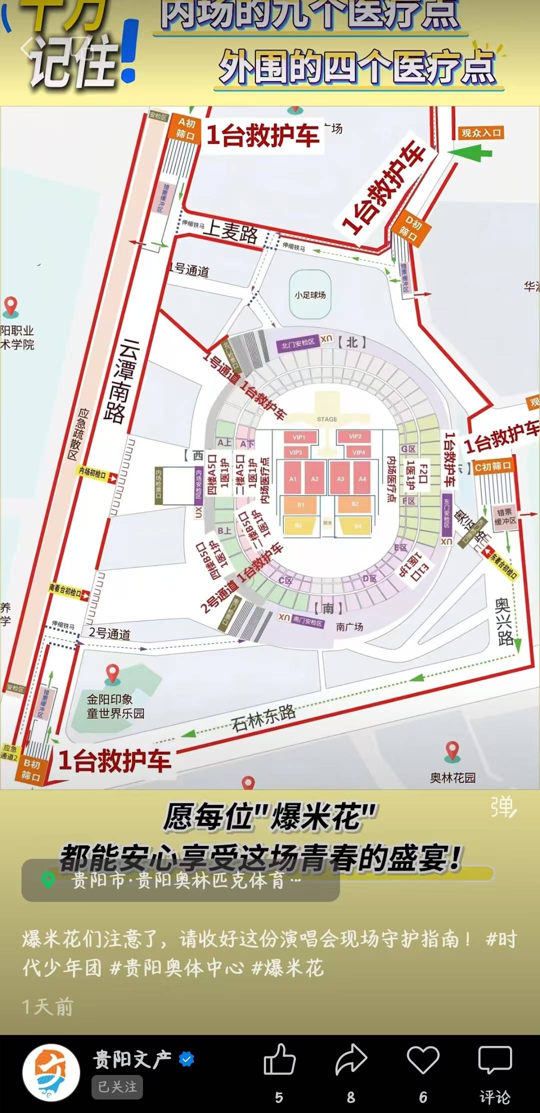 小红书账号“贵阳文产”没有蓝V认证,今年10月20日发布了第一条笔记,是一个还很新的账号。那么所谓的“错票缓冲区”是否存在?记者注意到,认证为贵阳文化产业有限公司的视频号“贵阳文产”此前发布的一条视频中展示的演唱会现场医疗点分布地图里,的确出现了四个红色区域标注的“错票缓冲区”,分别分布在ABCD四个初筛口旁边。据贵阳发布的介绍,贵阳文化产业有限公司于今年7月19日揭牌成立,是整合原贵阳广电传媒集团有限公司及贵阳日报传媒集团有限公司组建成立的一家市属文化企业,业务主要聚焦数智传媒、演艺会展、体育赛事、文化服务四大板块。