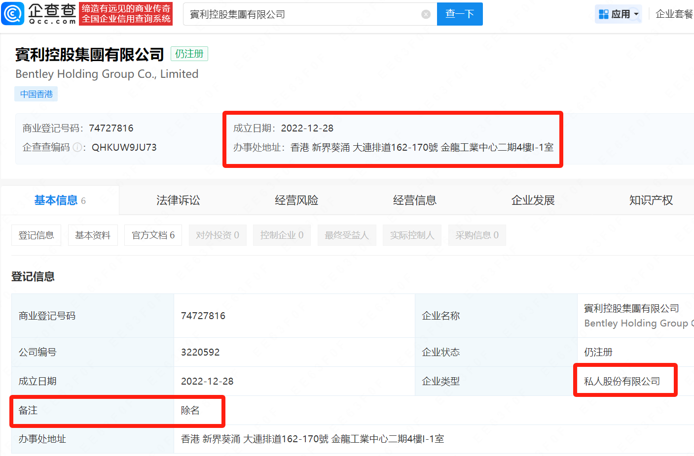 企查查APP显示,“宾利控股集团”是一家成立于2022年12月的香港私人股份有限公司,注册地址为香港新界葵涌大连排道162-170号金龙工业中心二期4楼I-1室,同一地址还注册有140多家不同行业的公司,属于典型的“集群注册”地址,该公司与英国豪华汽车品牌宾利并无关联。
