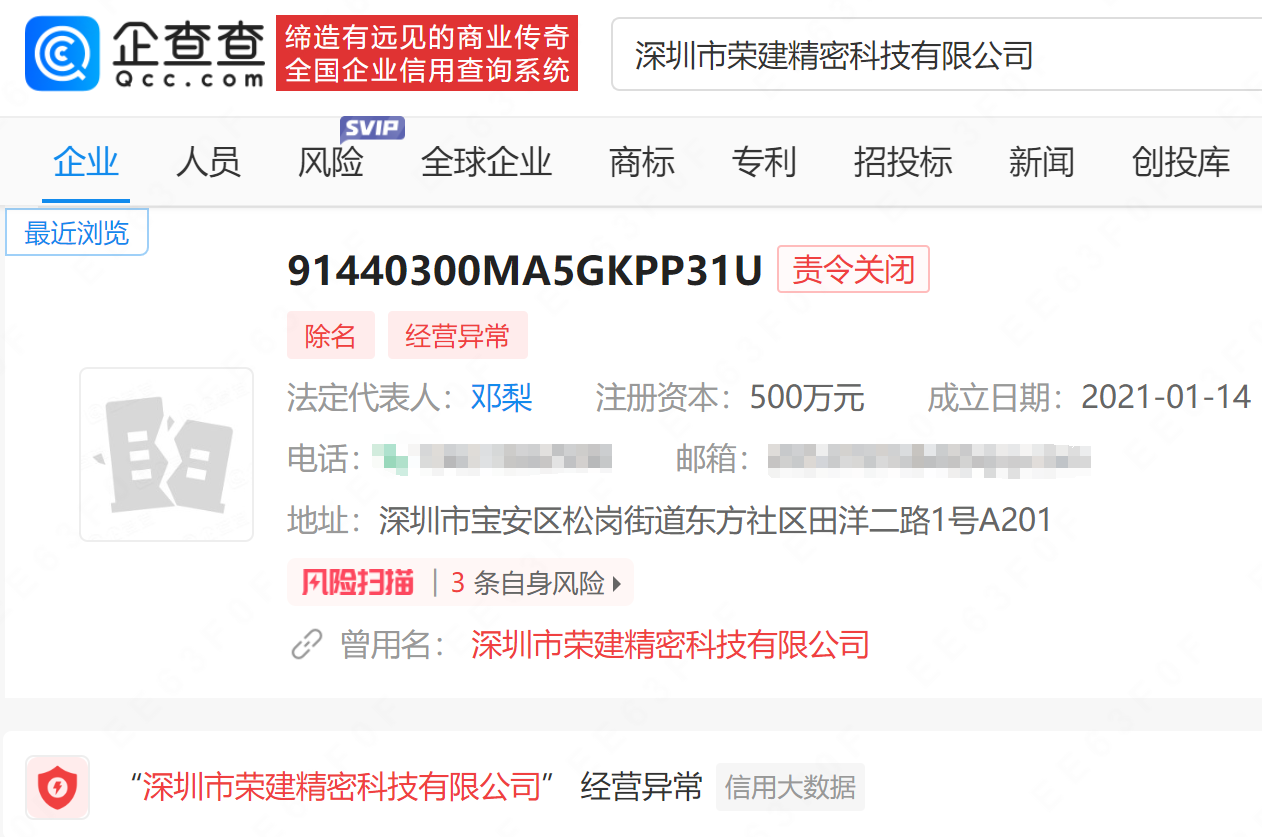 此次赛事的组委会主席邓梨名下共关联2家公司,分别是深圳市彩生活国际模特广告传媒有限公司和深圳市荣建精密科技有限公司,前者已于2020年12月注销,注销原因为被吊销营业执照;后者存在多条经营异常信息且被列入税务非正常户,并于2024年10月被责令关闭。