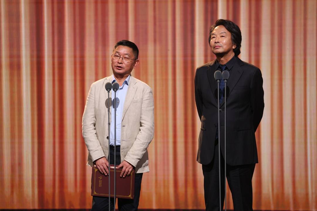中国作协副主席、江苏省作协主席毕飞宇(右)和江苏省作协党组书记、书记处第一书记、副主席郑焱(左)在颁奖现场祝贺祁智