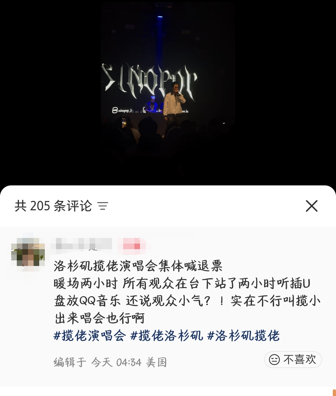 据悉,此次洛杉矶livehouse专场演出是揽佬美国巡演中的一站,门票上写的入场时间是晚上十点钟。然而实际上,当天晚上揽佬到晚上十二点钟才出场演出,此前的两个小时都由其他DJ在打碟热场,与观众互动。站了两个来小时的观众怒火中烧,“暖场两小时 所有观众在台下站了两小时听插U 盘放QQ音乐 还说观众小气?!”一名现场观众表示,自己是晚上九点半多开始排队准备入场,十点多顺利进场了,结果一头雾水的听土嗨的DJ直到晚上十二点多揽佬才终于出现了,等演出结束自己回家都凌晨两点了,“还特意提早来的,纯大冤种。”