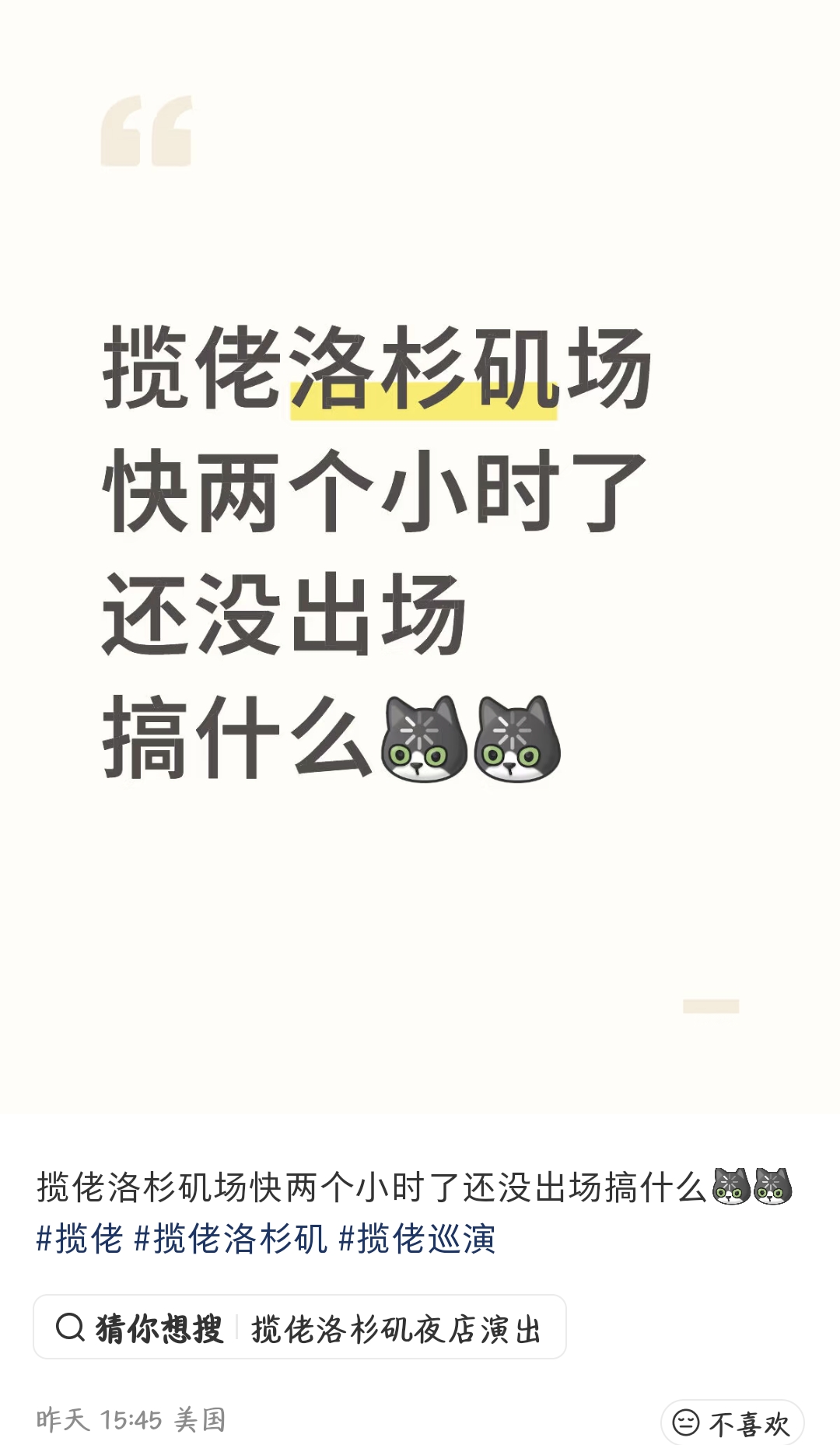 “罚站两小时,到底搞什么?”“揽佬洛杉矶演唱会迟到两个小时了,吃相难看。”11月22日,社交平台上出现大量吐槽说唱歌手揽佬洛杉矶专场演出的帖子,多位现场观众表示,在入场后歌手揽佬迟迟没有出场,等待到不耐烦的观众在现场高喊:“退票”,11月23日,揽佬发文解释了事情的前因后果,并向粉丝致歉,承认沟通过程存在失误。