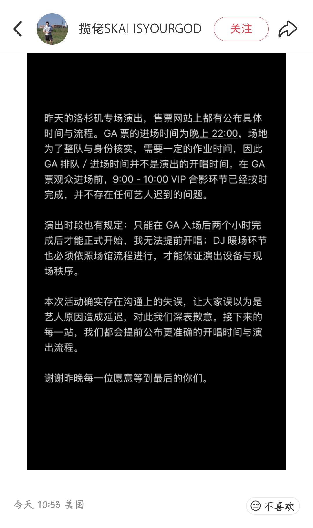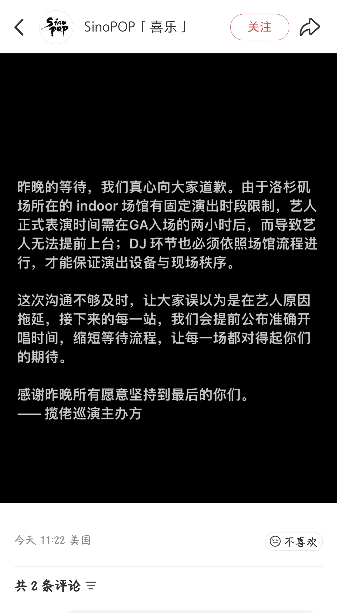 主办方sinopop也作出了同样的解释,“由于洛杉矶场所在的室内场馆有固定演出时段限制,艺人正式表演时间需在普通票入场的两小时后,而导致艺人无法提前上台;DJ环节也必须依照场馆流程进行,才能保证演出设备与现场秩序。这次沟通不够及时,让大家误以为是在艺人原因拖延,接下来的每一站,我们会提前公布准确开唱时间,缩短等待流程,让每一场都对得起你们的期待。”
