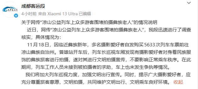 11月24日,成都客运段回应游客围堵拍摄彝族老人事件并发布了情况说明。