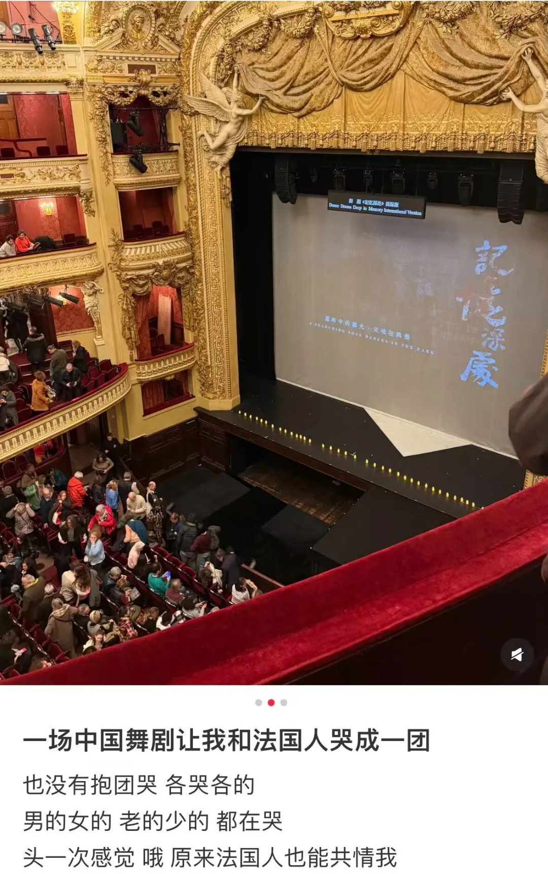 在社交平台上,也有不少旅法华人分享了自己的观看感受,“一场中国舞剧让我和法国人哭成一团,男的女的,老的少的,都在哭。头一次感觉,哦,原来法国人也能共情我。”“毫不夸张,我从头哭到尾,情绪完全失控,我能清晰听到身边的啜泣声,有人默默擦泪,有人紧握双手。谢幕时,掌声久久不息,如潮水般涌来,成了我最后痛哭的掩护。听到周围不断响起‘太棒了!绝妙’的赞叹,这让我无比欣慰,这段历史不仅我们中国人铭记,也真正走进了外国人的心里。”从一些旅法华人发布的谢幕视频中也能看到,当演员们鞠躬谢幕时,观众们都站了起来,报以热烈的掌声。本剧导演佟睿睿在社交平台写道:“舞者的表达超越语言和文化的屏障,我们的记忆成为了全世界共同的记忆,为各国艺术家的努力致敬,为实现这一刻的每一位致敬。”