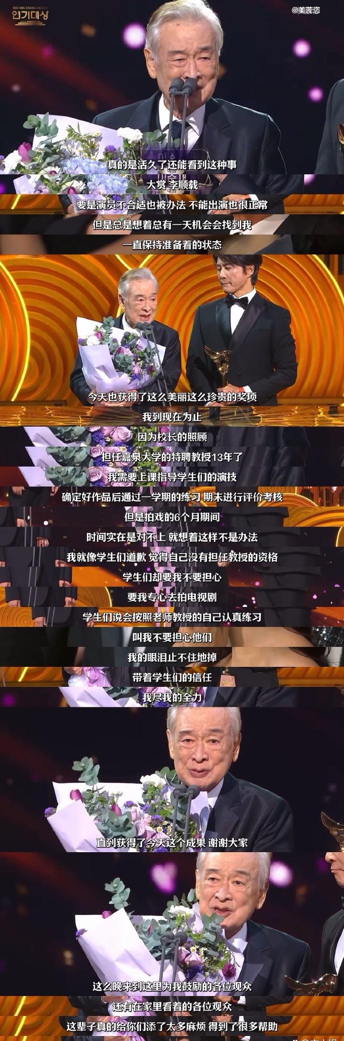 这位演艺界的常青树,直到生命尾声都未曾离开他热爱的舞台。就在今年初,他还以89岁的高龄,凭借电视剧《狗话》斩获KBS演技大赏,创下韩国史上最年长演技大赏得主的纪录。在当时的颁奖礼上,这位老艺术家的眼中闪烁着激动的泪花。“演技应该用演技本身来评价,而不是以人气作为衡量的标准”, 李顺载如是说道。“这辈子添了太多麻烦,但得到无数帮助,谢谢大家。” 这番话,如今听来更像是一场温暖的告别。