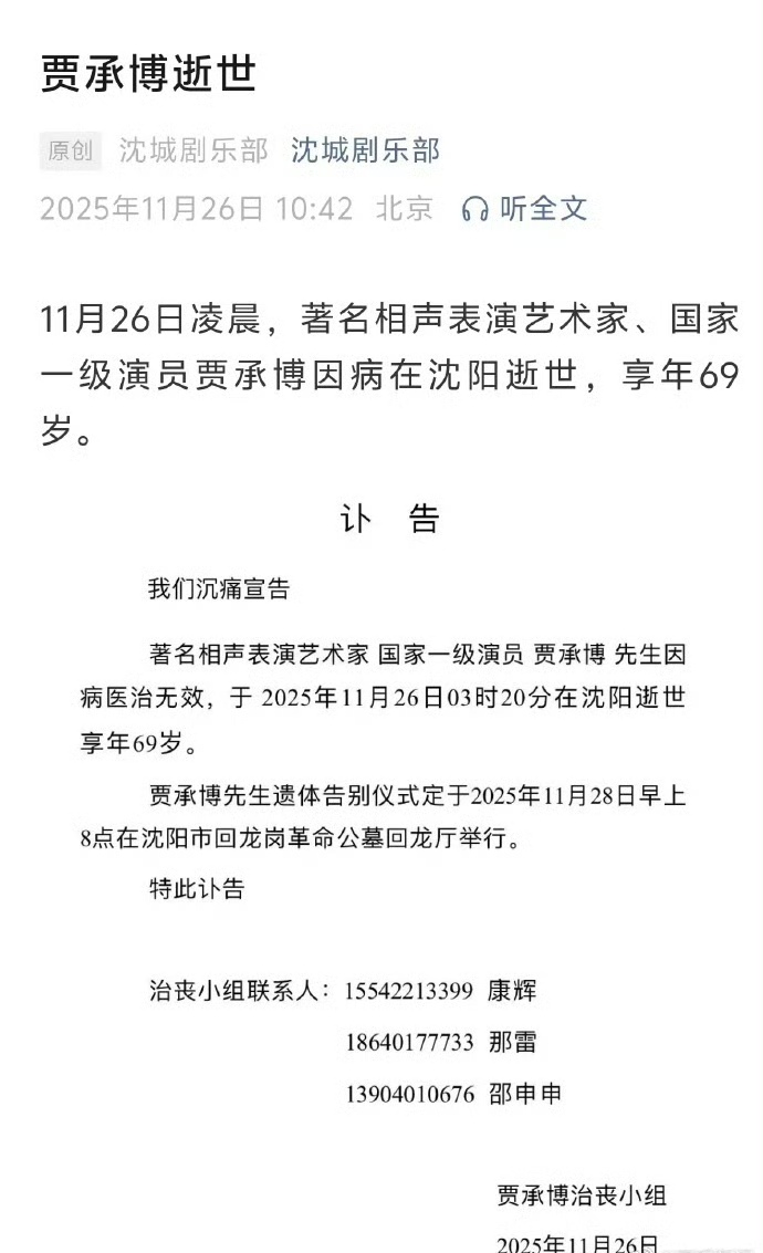 11月26日凌晨,著名相声表演艺术家、一级演员贾承博因病在沈阳逝世,享年69岁。
