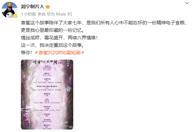 11月26日下午,《香蜜沉沉烬如霜》制片人刘宁正式官宣将重新制作短剧版《香蜜沉沉烬如霜》,“香蜜这个故事陪伴了大家七年,是我们所有人心中不能忘怀的一份精神电子食粮,更是我心里最珍藏的一份记忆。情丝成烬,霜花盛开,再续六界情缘!这一次,我决定重启这个故事。”电视剧《香蜜沉沉烬如霜》的官方微博也发布了这一条信息,并发布了一条概念短片,配文“有只魇兽来提醒你,香蜜系统准备重启啦!全新演绎六界虐恋传奇,准备开团,各位道友快跟上。”