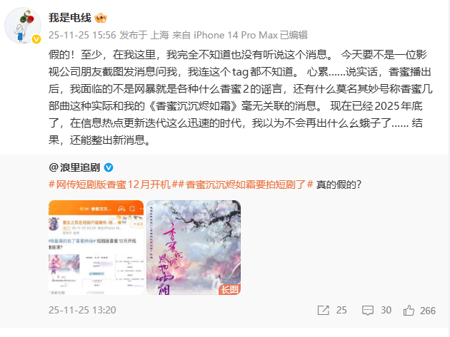 然而令人意外的是,就在11月25日,《香蜜沉沉烬如霜》的原著作者电线才辟谣过这一消息。25日,有自媒体博主爆料香蜜短剧版要在今年12月底开机了,已在社交平台消失了两年多的电线通过社交平台对此进行辟谣,似乎对此事完全的不知情:“假的!至少,在我这里,我完全不知道也没有听说这个消息。今天要不是一位影视公司朋友截图发消息问我,我连这个tag都不知道。”电线称:“香蜜播出后,我面临的不是网暴就是各种什么香蜜2的谣言,还有什么莫名其妙号称香蜜几部曲这种实际和我的《香蜜沉沉烬如霜》毫无关联的消息。 现在已经2025年底了,在信息热点更新迭代这么迅速的时代,我以为不会再出什么幺蛾子了…… 结果,还能整出新消息。”没想到此次的网传消息是真的,电线对此没有做出回应。