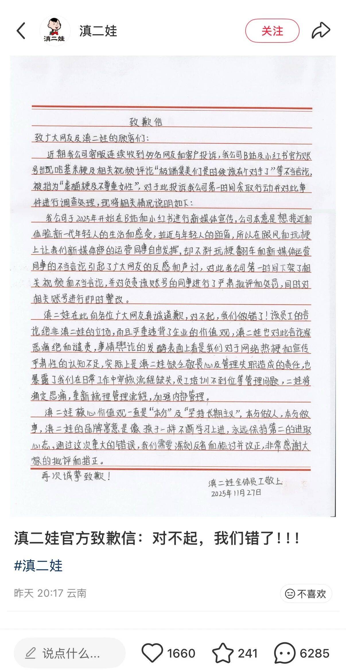 11月27日晚,“滇二娃”官方账号发布手写致歉信,承认言论不当,已处罚相关人员。致歉信中说,公司本意是想接近和体验新一代年轻人的生活和感受,拉近与年轻人的距离,所以在跟风和玩梗上让新媒体部的运营同事自由发挥,不料玩梗翻车和新媒体运营同事的不当言论引起网友反感和声讨。
