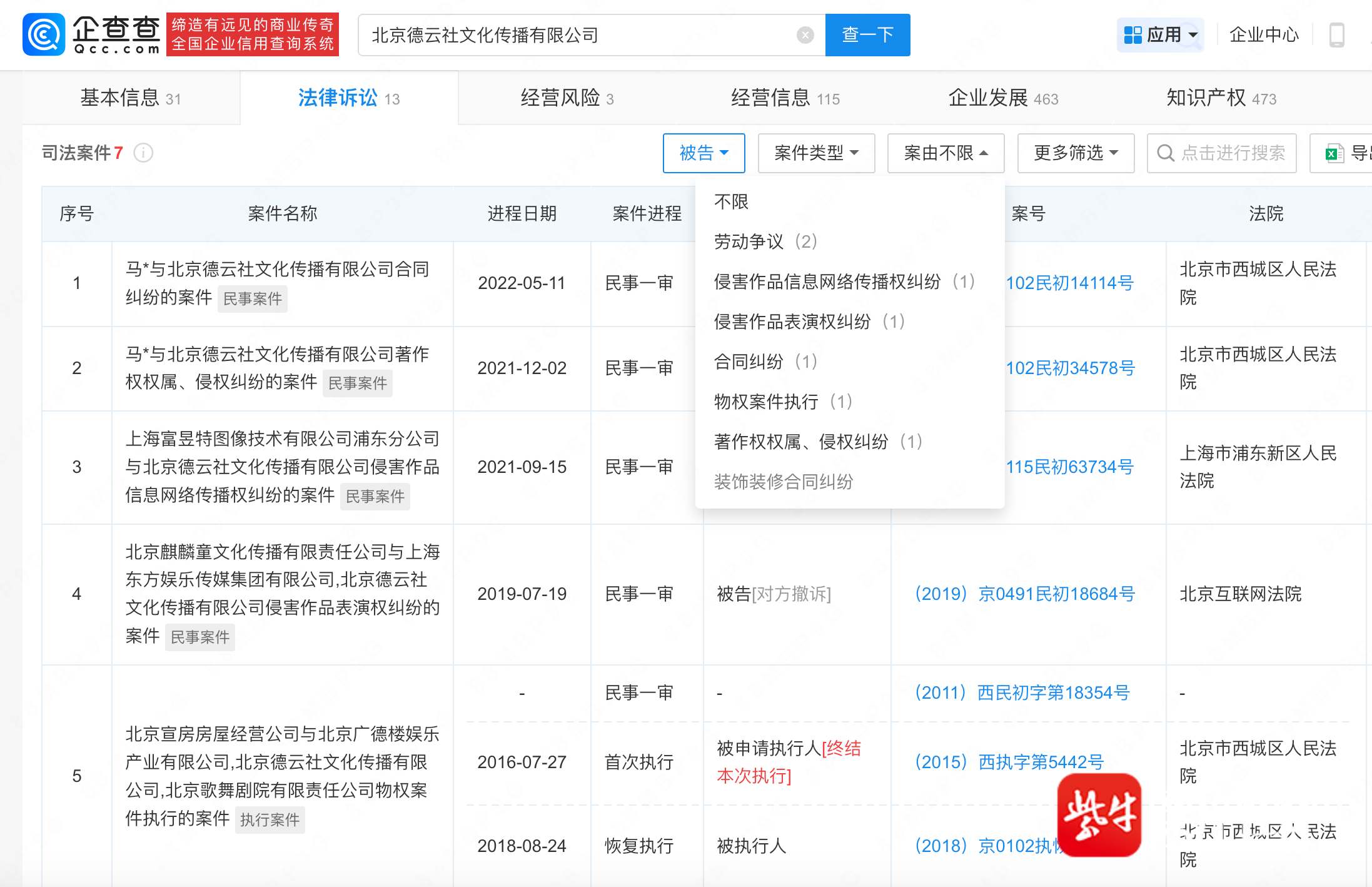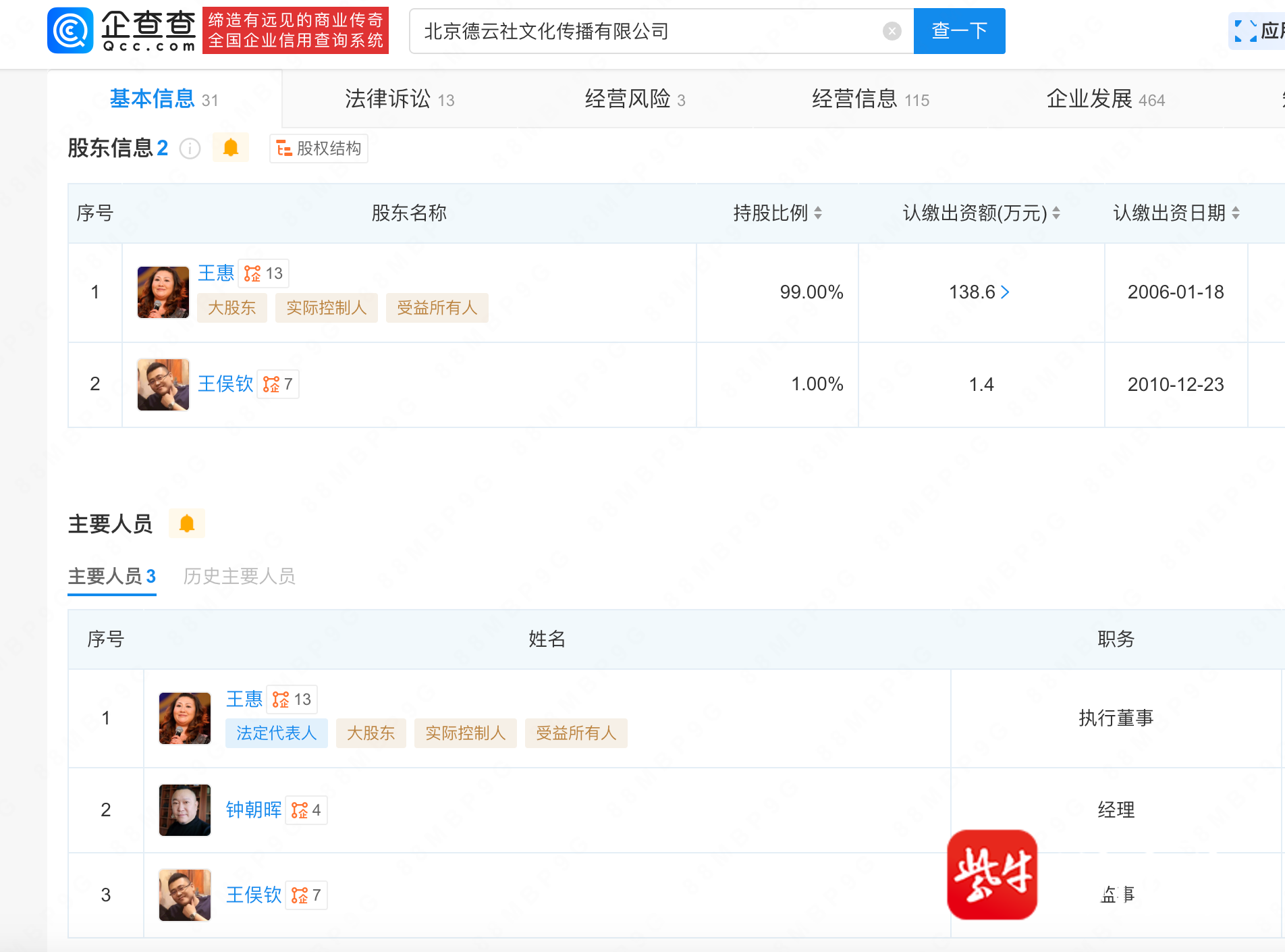 查询企查查APP显示,北京德云社文化传播有限公司成立于2006年1月,法定代表人为王惠,注册资本140万人民币,由王惠、王俣钦分别持股99%、1%,该公司作为被告身份涉及多起法律诉讼,案由包括侵害作品信息网络传播权纠纷、侵害作品表演权纠纷等。此外,该公司现存多则行政处罚信息,处罚事由包括“未按要求接受年度核验”等。
