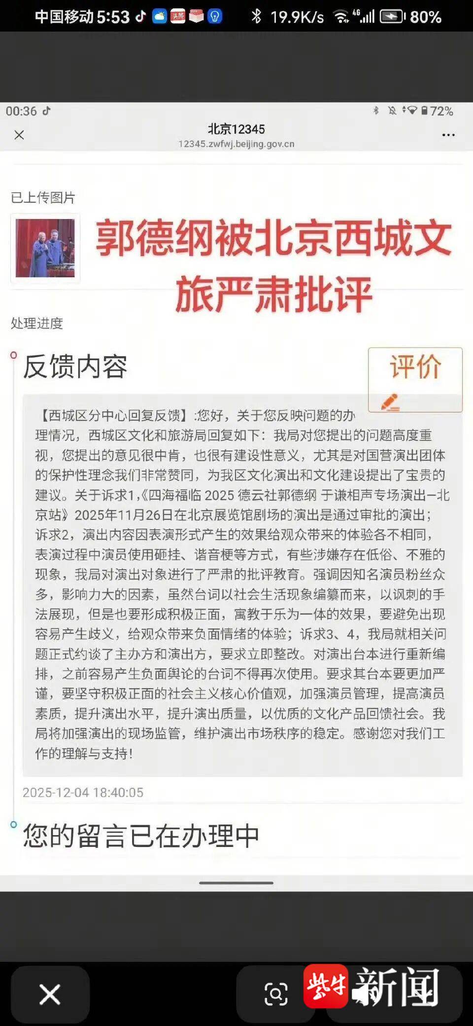 网络上还流传着两张截图。一张是网友12月2日提交给北京12345的投诉截图,投诉内容称郭德纲与于谦在2025年11月底的北展相声专场中表演的《艺高人胆小》存在大量伦理哏、荤段子、骂黑粉及造谣抹黑国营院团等台词。