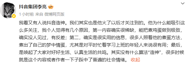 对此,12月12日傍晚,抖音集团副总裁李亮回应,否认了这是抖音的“造神”,李亮表示,实际上平台是在该博主火了之后才关注到,对于该博主会这么火的原因,李亮推测一方面是因为内容确实很稀缺,能把煮鸡蛋做到极致的确实没人见过,有反差。另一方面,该博主的内容很实用,很多人跟着学煮鸡蛋,煮出来了“梦中情蛋”,最后,唤起了大家对好好生活、认真生活的共鸣。“其实没有什么算法造神,很多时候就是这个内容或者作者一下子踩中了普遍的社会情绪。”